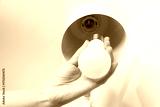 Woman changing light bulb in lamp near grey wall at home, closeup