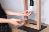 Woman changing light bulb in lamp near grey wall at wooden chest of drawers indoors, closeup