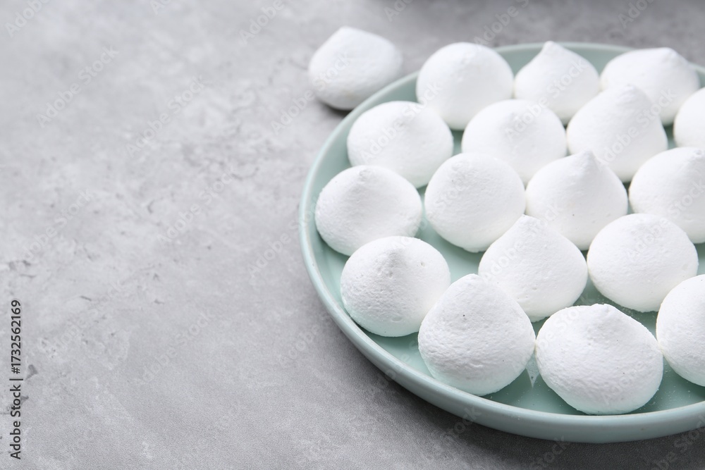 Yummy meringue cookies on grey table, closeup. Space for text