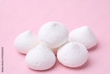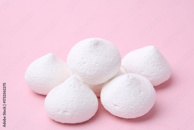 Many yummy meringue cookies on pink background, closeup