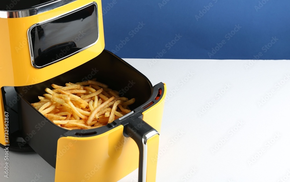 Air fryer with cooked fries on white table against blue background, closeup. Space for text
