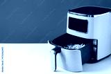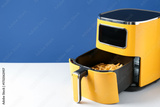Air fryer with cooked fries on white table against blue background, closeup. Space for text