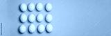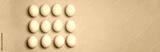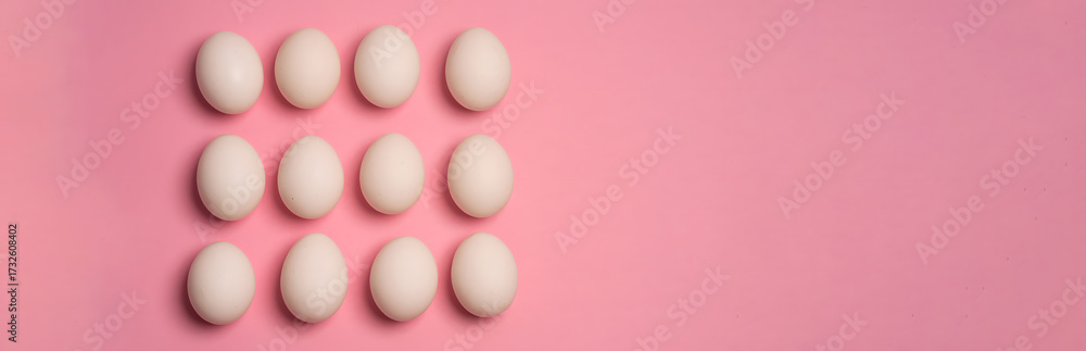 White chicken eggs neatly arranged in three-by-four grid on pastel pink background. Concept of food, breakfast, protein, organic farming and modern minimal flat lay.