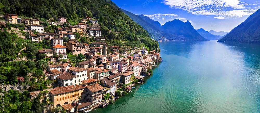 lake Lugano Switzerland. most beautiful traditional villages - scenic Gandria with colorful houses ..Ticino region ,Border with Italy. Aerial drone panoramic view