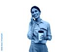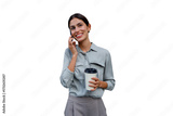 Woman holding a coffee cup and having a business call, smiling, communicating, and networking. Transparent background