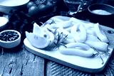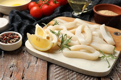 Uncooked squid rings, spices, yolk, tomatoes and bread crumbs on wooden table, closeup