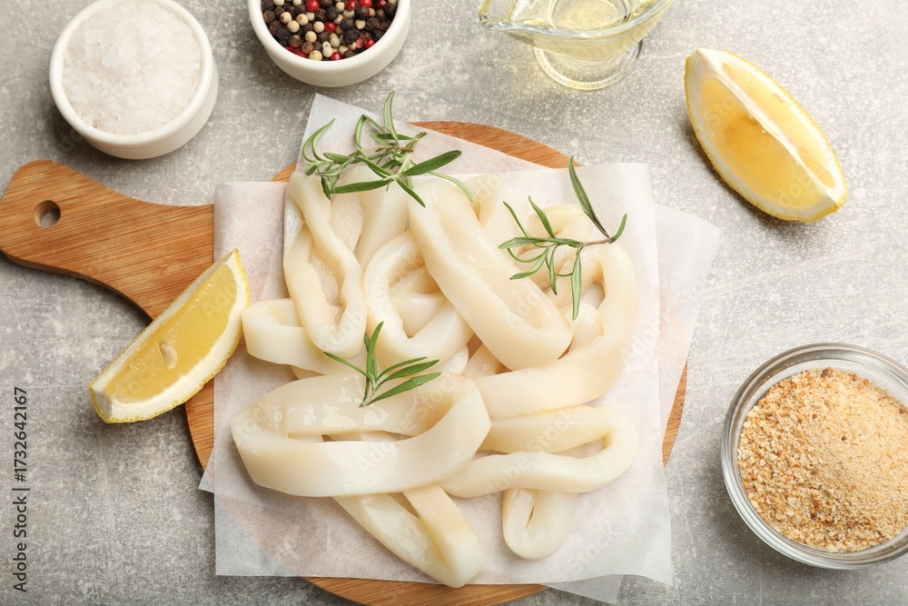 Uncooked squid rings, spices and bread crumbs on grey table, flat lay