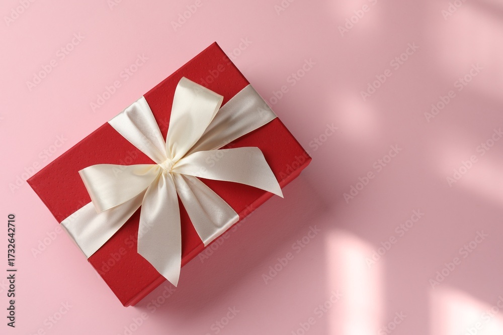 Beautiful gift box with bow on pink background, top view. Space for text