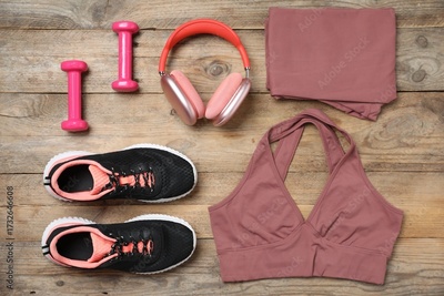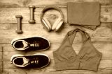 Sportswear, shoes, headphones and dumbbells on wooden background, flat lay