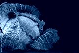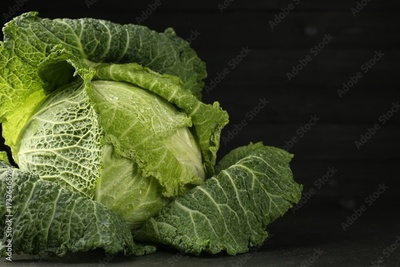Fresh Savoy cabbage on black table, closeup. Space for text