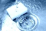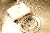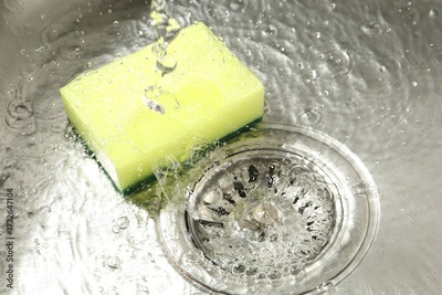 Water going down drain and sponge in sink, closeup