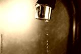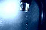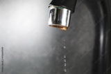 Water dripping down from faucet on grey background, closeup. Space for text