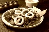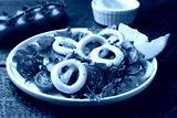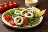 Delicious salad with squid rings, vegetables and spices served on wooden table, closeup