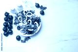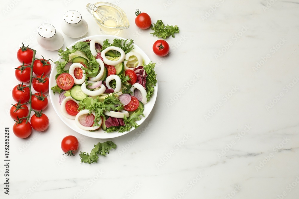 Delicious salad with squid rings and vegetables served on white marble table, flat lay. Space for text
