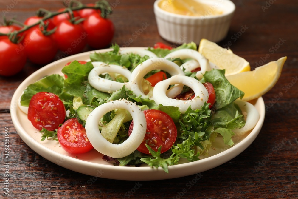 Delicious salad with squid rings and ingredients on wooden table, closeup