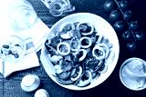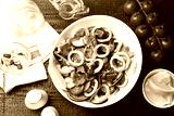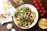 Delicious salad with squid rings and vegetables served on wooden table, flat lay