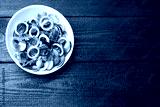 Delicious salad with squid rings, nuts and vegetables in bowl on wooden table, top view. Space for text
