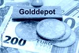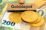 Einige Goldmünzen liegen zusammen mit einem Holzstempel als Symbolbild für Goldpreis im Golddepot