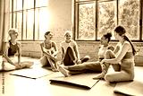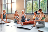 Diverse group of women in sportswear chatting after workout in modern loft fitness studio.