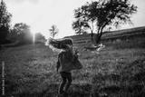 Little girl holding ribbon headband walking in autumn meadow at sunset.