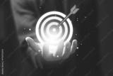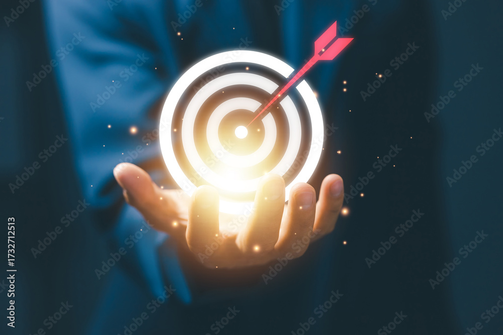 Hand holding digital target icon with arrow in the center, representing business goal, success strategy, marketing objective, and achievement of performance in modern business.
