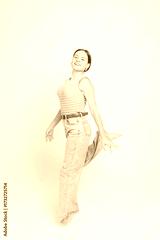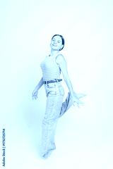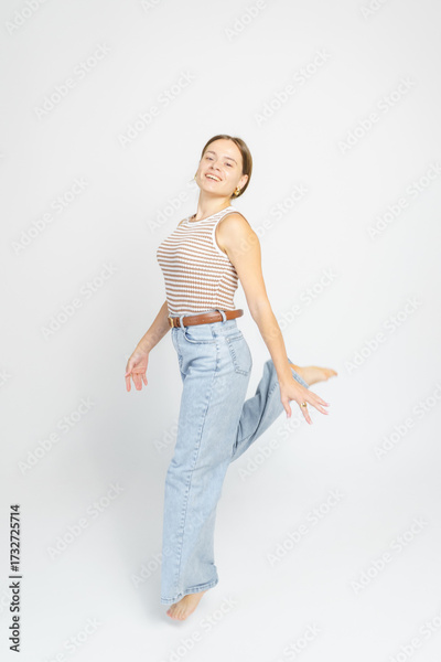 Studio shot of a stylish young woman in blue jeans and a striped T-shirt jumping against a white background
