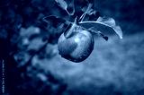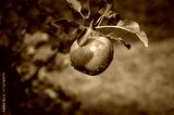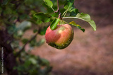 A Champion apple, sunlit after rain, on a branch in the orchard.