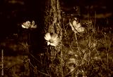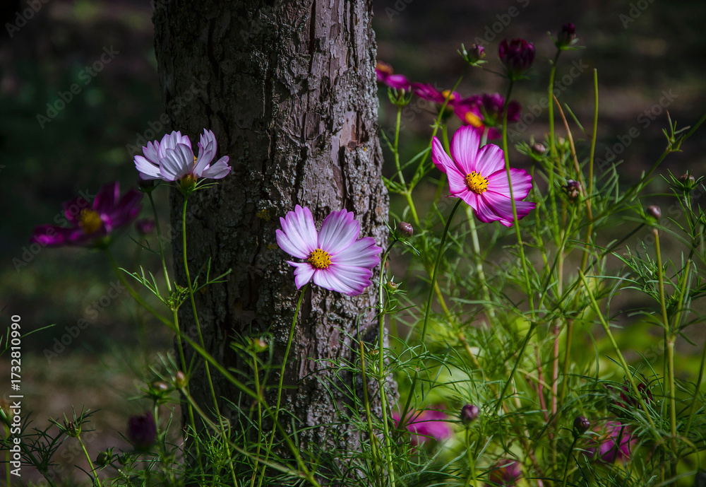 Cosmos flowers blooming in the garden against the backdrop of an old pear tree.