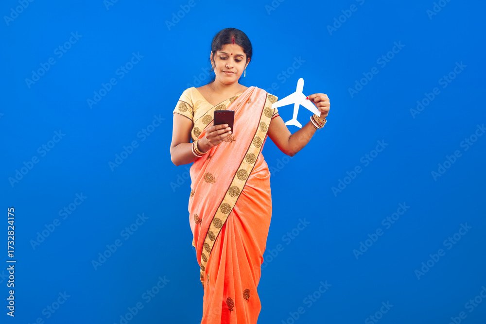 Indian female in sari presenting a paper airplane model and mobile phone representing tourism, travel planning, and digital connectivity.