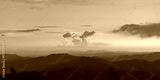 Scenic view of distant mountains with layered ridges under a pastel colored sky and fluffy clouds
