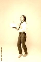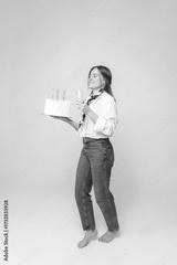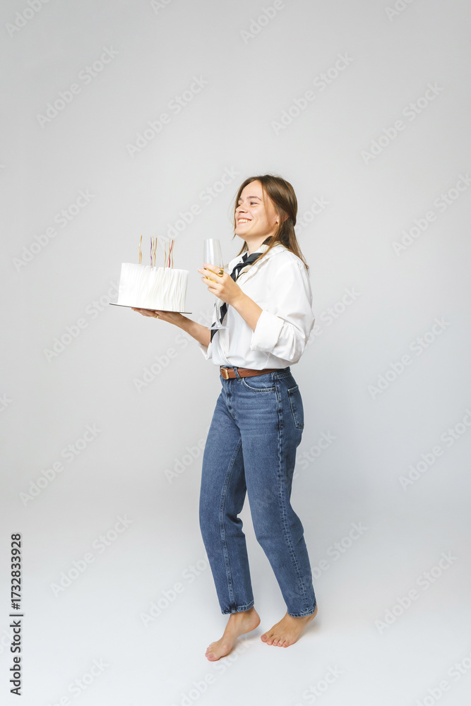 Elegant smiling woman holding champagne and cake at holiday party while jumping on white background