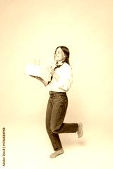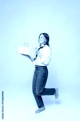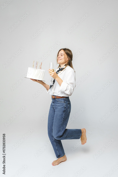 Elegant smiling woman holding champagne and cake at holiday party while jumping on white background