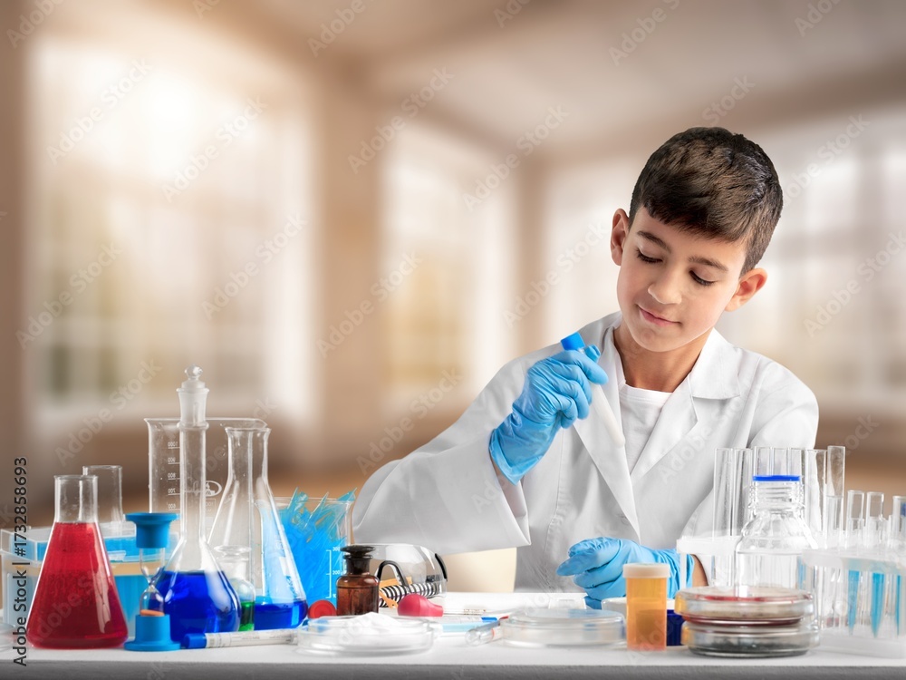 Little child make chemistry science experimental chemistry lessons.