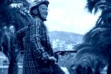 Smiling senior caucasian cyclist woman in leisure activity in urban park riding with electric bike enjoying healthy lifestyle