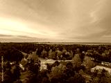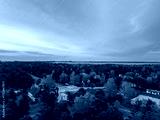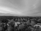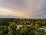 Golden-hour aerial view of Manniku district, Tallinn, Estonia, showing pine forest, scattered houses, railway tracks and Lake Ulemiste under soft pastel evening sky (Estonian - Manniku, Ülemiste)