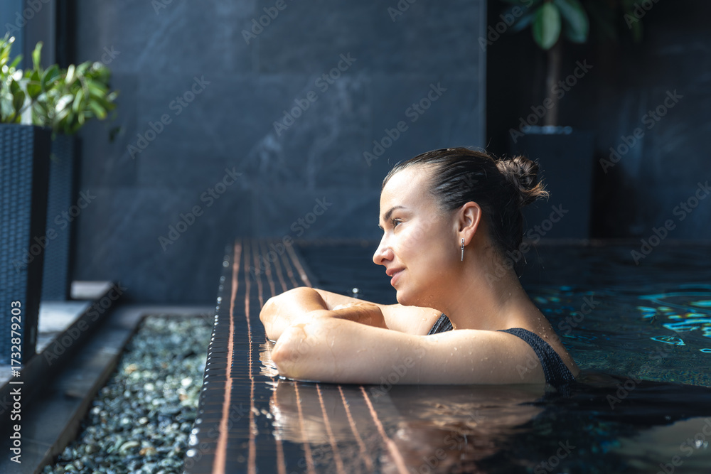 Woman leaning on pool edge with dreamy look. Calm pause.