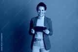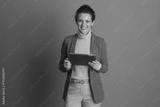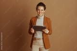 A confident, smiling woman in smart casual business attire holds digital tablet horizontally, looking at the camera. Her brown blazer and beige turtleneck convey professional yet approachable demeanor