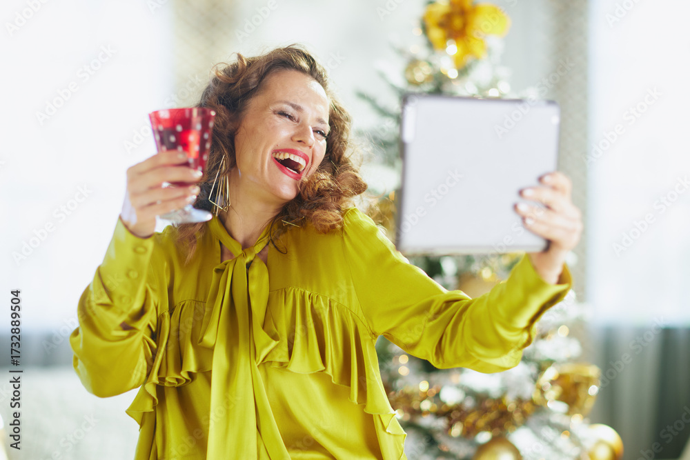 A smiling woman with curly brown hair, wearing a yellow ruffled blouse, takes a joyful selfie with her tablet and a festive red drink. A blurred, decorated Christmas tree creates a happy holiday mood.