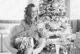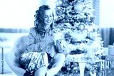 A joyful woman with curly brown hair, wearing an elegant green blouse and sequined skirt, sits in a chair, happily holding a gold-patterned Christmas gift box. A festive tree sparkles behind her.