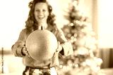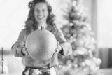 A smiling woman in a satin blouse holds a large, glittery gold Christmas ornament, capturing the essence of holiday decorating against a backdrop of warm bokeh lights.