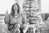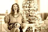 A smiling middle-aged woman with curly brown hair, dressed in green satin blouse and sequined skirt, sits with fingers crossed, looking upwards expectantly.