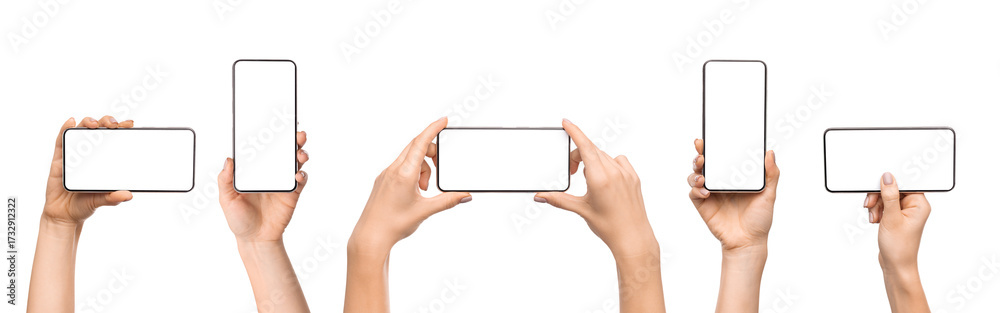 Set of women hands holding smartphone with blank screen in different orientation isolated on white background, panorama