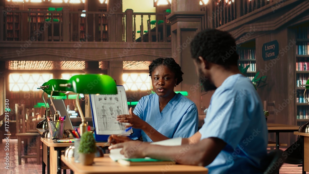 Black med school students team reading anatomy textbooks and class notes at the library, study group learning session. People focusing on exam preparation for a medical career. Camera B.