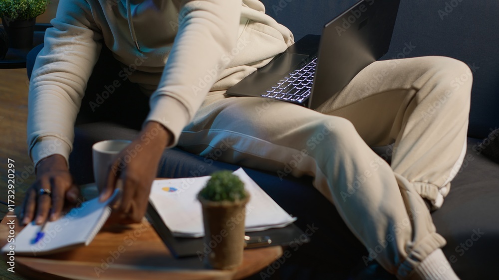 Casual person sitting On the sofa and reading research papers with analytics, multitasking with laptop at home. Man diving into professional or personal topics of improvement, independent. Camera A.