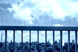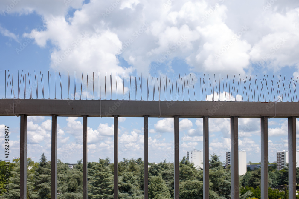 Stainless bird spikes on balcony railing for pest prevention and architectural protection. Useful for facility management, building security, urban maintenance companies