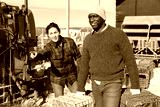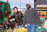 Positive african american worker carrying empty plastic crates at farm while focused asian female farmer giving him instructions and pointing where to stack boxes