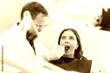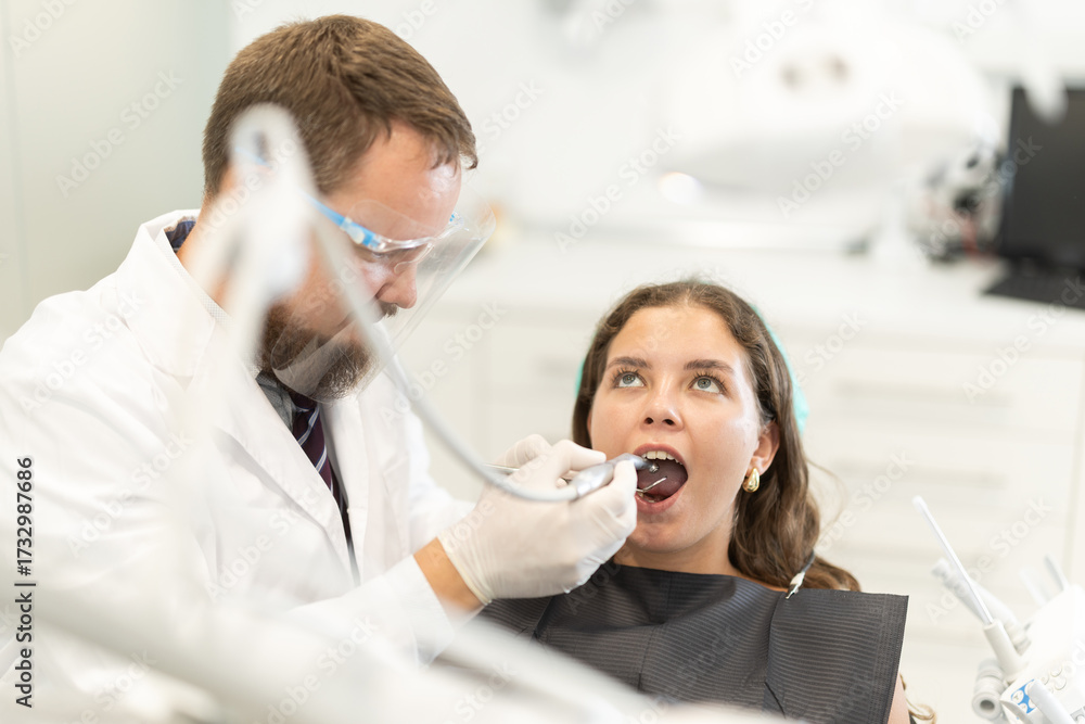 Girl is sitting in armchair during dental treatment at dentist appointment. Man doctor performs procedure of restoration and improvement of teeth, uses technological device