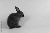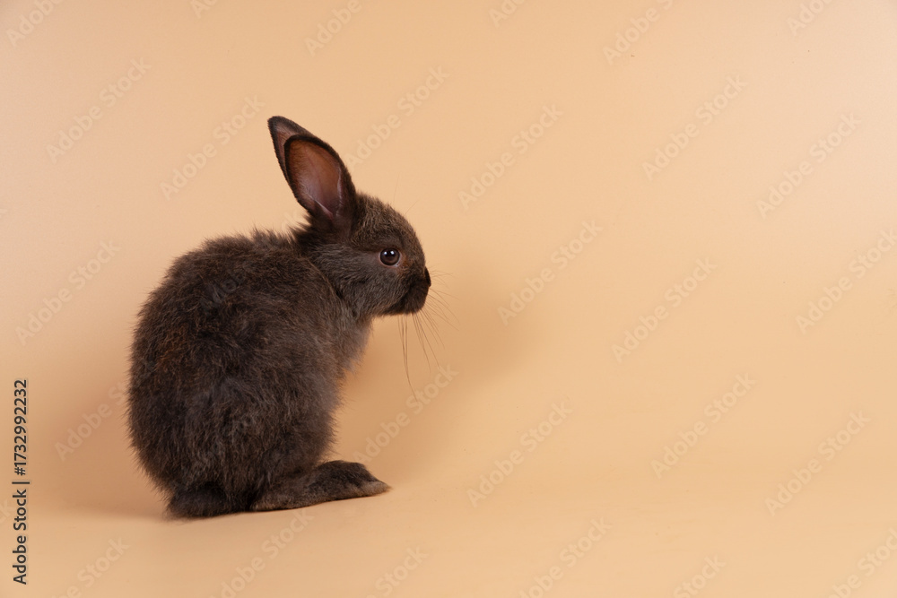 Adorable baby rabbit bunny looking at something while sitting over isolated pastel background with copy space. Cuddly furry rabbit black bunny playful on yellow. Easter holiday animal pet concept.