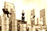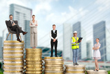 People of various professions standing on different stacks of coins according to their salaries against blurred cityscape. Concept of rich, wealth