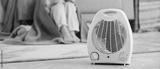 Electric fan heater on floor against little girl playing video game at home, closeup